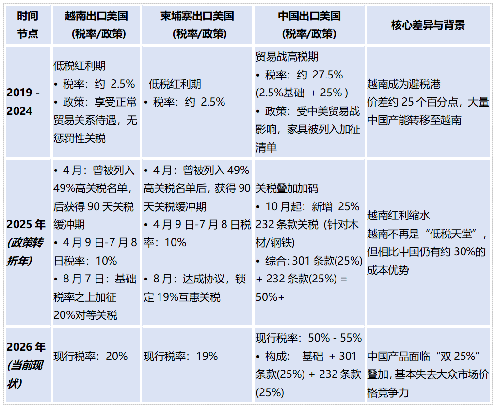 这一布局的核心逻辑在于“成本最优”与“风险规避”。一方面,东南亚国家在人工、土地及原材料(如木材)等要素成本上具备天然优势,加之公司已在越南当地及周边完成了大部分零部件的配套,形成了完整的产业链集群。在此基础上,匠心家居坚定推行“轻资产起步+重资产择机切入”的战略,通过在越南租赁厂房快速落地主要产能。这种模式不仅降低了前期重资产投入的风险,确保了应对国际贸易政策变化的灵活性,还能享受当地增值税退税和所得税优惠。另一方面,更为关键的是,利用越南出货在2025年前无需承担美国加征关税的政策窗口,有效规避了对华关税风险。