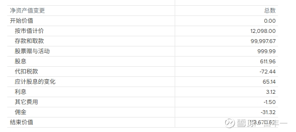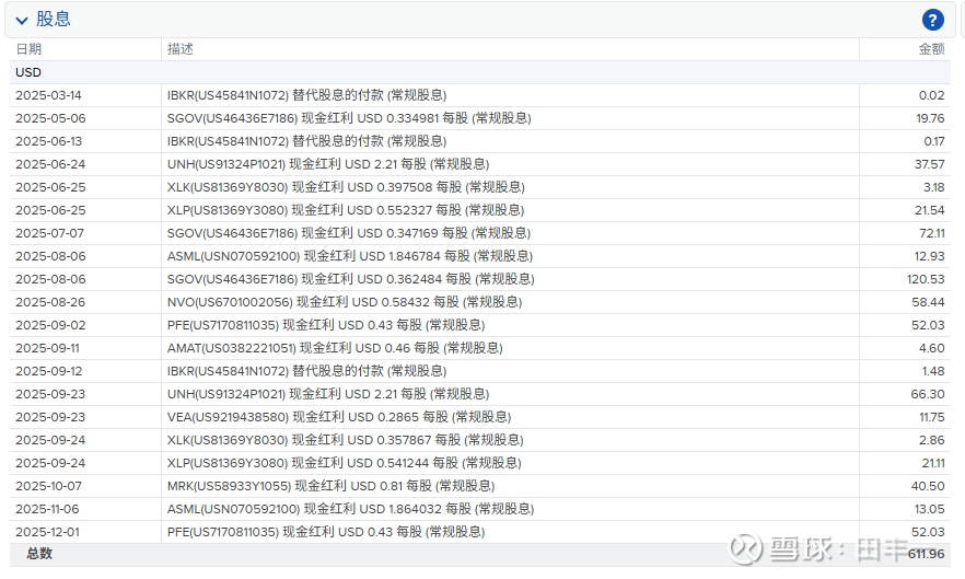股息与利息(Dividends & Interest):收了股息 611.96 美元,利息 3.12 美元。被预扣税款(Withholding Tax) 72.44 美元。