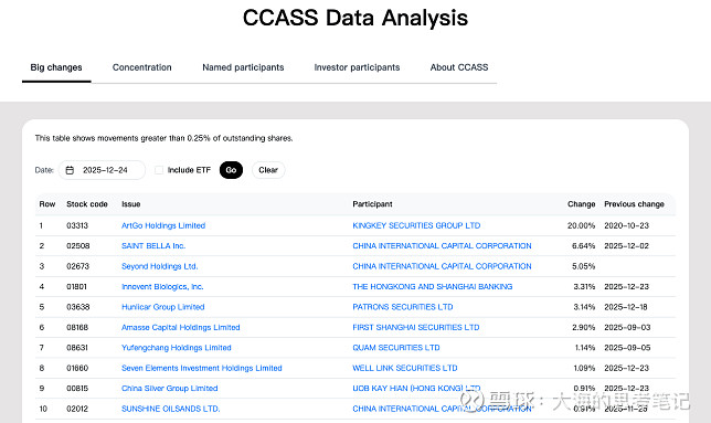 2. CCASS 持仓透视: 实时追踪中央结算系统的股权变动,辅助研判庄家动向与股权集中度。