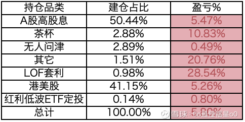 本周总持仓-0.25%,对比周一已觉得十分侥幸,其中:高股息模式-0.09%、茶杯模式+1.06%(微盘股+2.20%)、无人问津模式-4.04%(没有做到紧跟老杜)、其它-0.68%(过渡阶段买了沪深300想要短线博弈)、套利-2.24%(对比盈利属于小幅回撤,风险收益比很好)、港美股-0.23%(有些短线博弈亏钱了)、红利低波ETF+0.59%(本月要在水面上定投了)