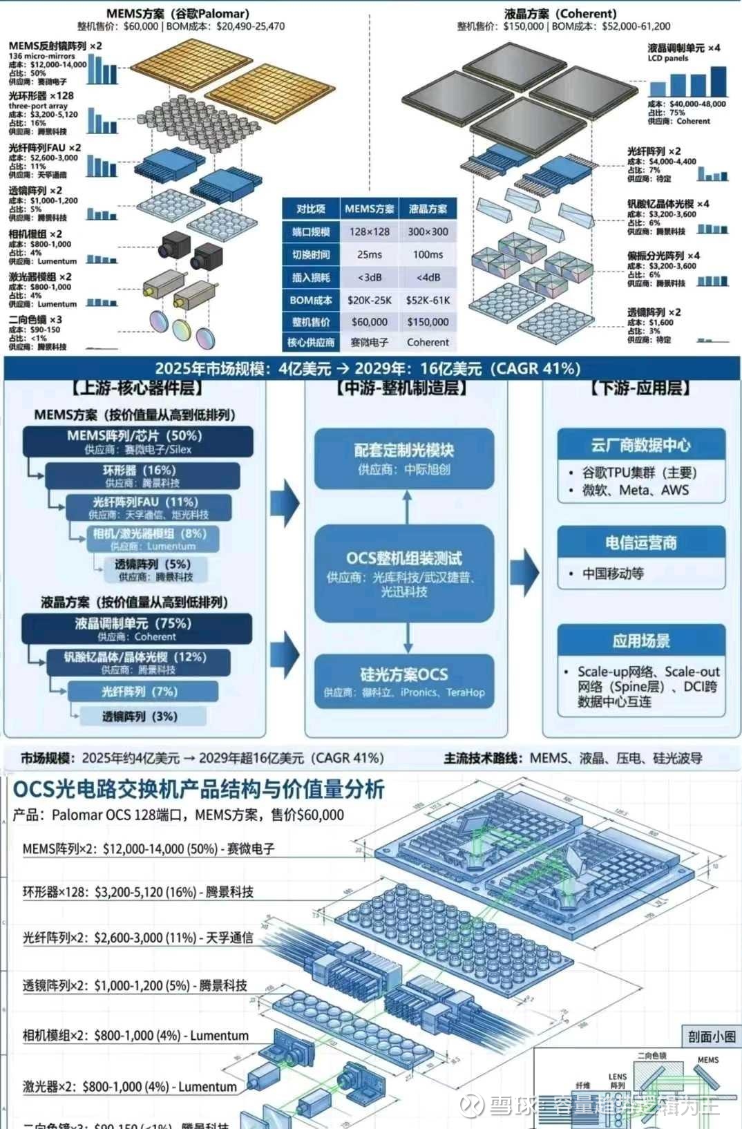 光学电路交换机OCS通过微机电系统MEMS反射镜阵列等技术,在物理层面改变光束的传播路径,从而实现任意输入端口与任意输出端口之间的直接光连接,这种连接是“电路交换”的,数据流就可以像火车一样,以光速、近乎零延迟、无冲突地通过,直到任务完成。