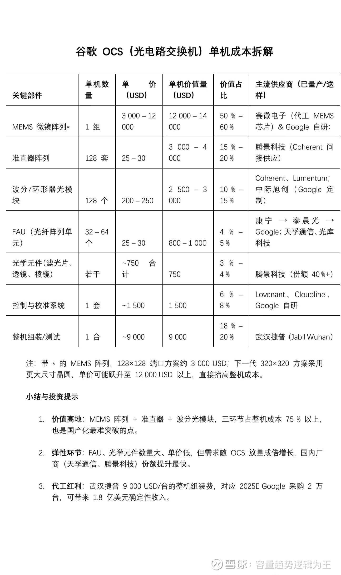 1. 自身出货量随TPU放量激增 :OCS与谷歌TPU的数量配比基本稳定在85:1左右,2026年谷歌TPU出货量预计达400 - 500万颗,仅这一需求就将带动近4.7万台OCS出货。而且谷歌此前已部署数万台OCS,当下其对外销售TPU的同时也开始搭配OCS销售,比如给Anthropic供应100万只TPU就对应约1.2万台OCS需求,后续出货量还会持续攀升。
