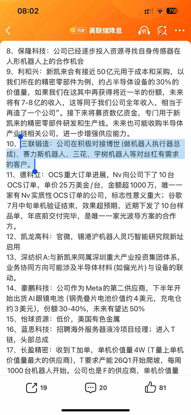 机器人、三花、宇树机器人等对丝杠有需求的客户。