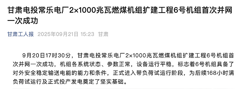 甘肃电投常乐电厂六号机组投入运营