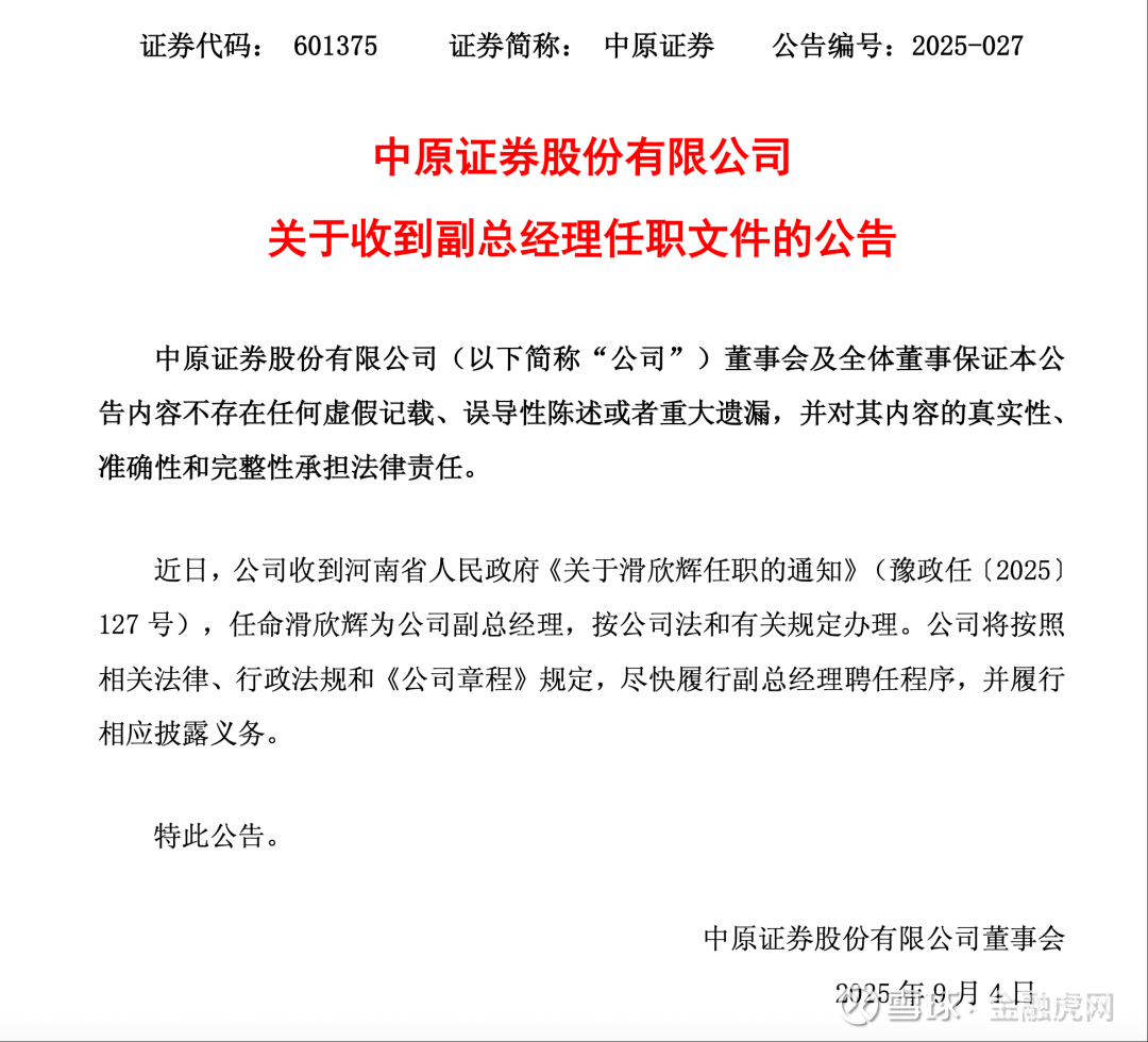 金融虎讯 9月4日消息,日前,中原证券股份有限公司发布关于收到副总经理任职文件的公告。公告显示,近日,公司收到河南省人民政府《关于滑欣辉任职的通知》(豫政任〔2025〕127号),任命滑欣辉为公司副总经理,按公司法和有关规定办理。公司将按照相关法律、行政法规和《公司章程》规定,尽快履行副总经理聘任程序,并履行相应披露义务。