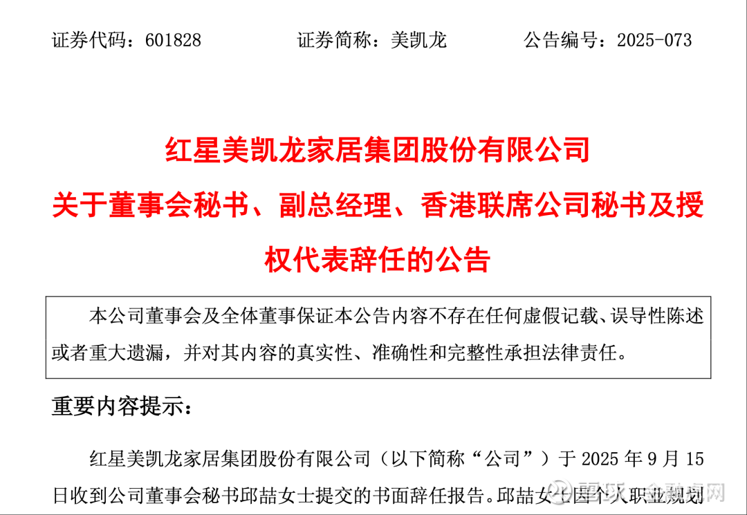 2025年9月15日,红星美凯龙收到董事会秘书邱喆女士的书面辞任报告。邱喆女士因个人职业规划原因,申请辞去公司第五届董事会董事会秘书、副总经理职务,同时不再担任香港联席公司秘书及授权代表,辞任后也将不在公司及控股子公司担任其他职务。