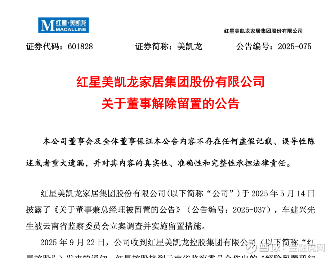 而就在2025年9月22日,公司收到红星美凯龙控股集团有限公司发来的通知。红星控股接到云南省监察委员会作出的《解除留置通知书》,这意味着云南省监察委员会已经对车建兴先生解除了留置措施。