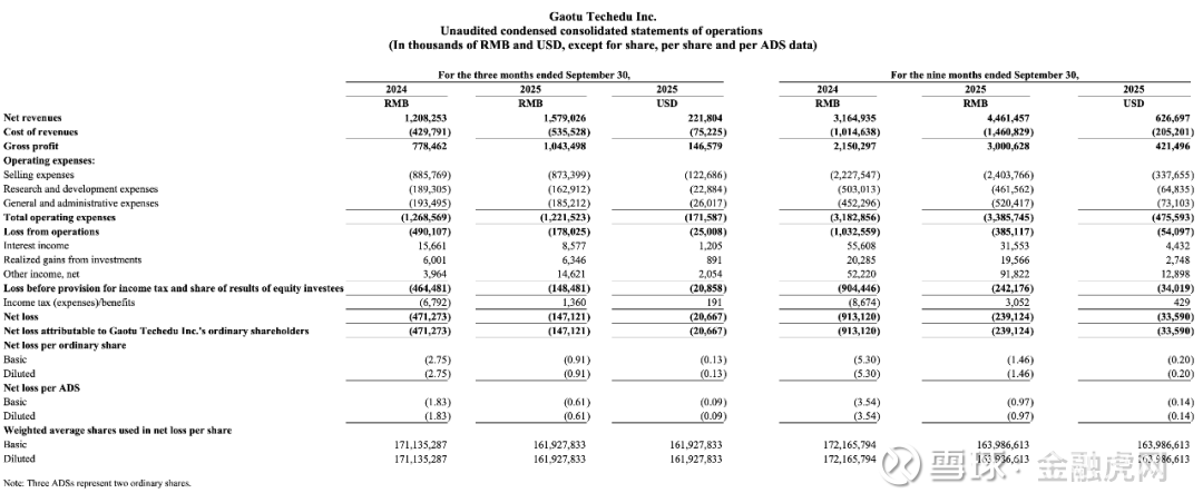 金融虎讯 11月27日消息,日前,高途发布2025年第三季度财务业绩。公告显示,高途2024年第三季度净收入为15.79亿元,同比增长30.7%;净亏损为1.471亿元,同比收窄68.8%。