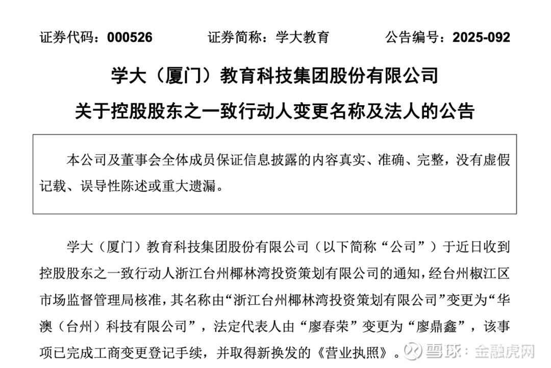 金融虎讯 12月10日消息,日前,学大(厦门)教育科技集团股份有限公司发布关于控股股东之一致行动人变更名称及法人的公告。