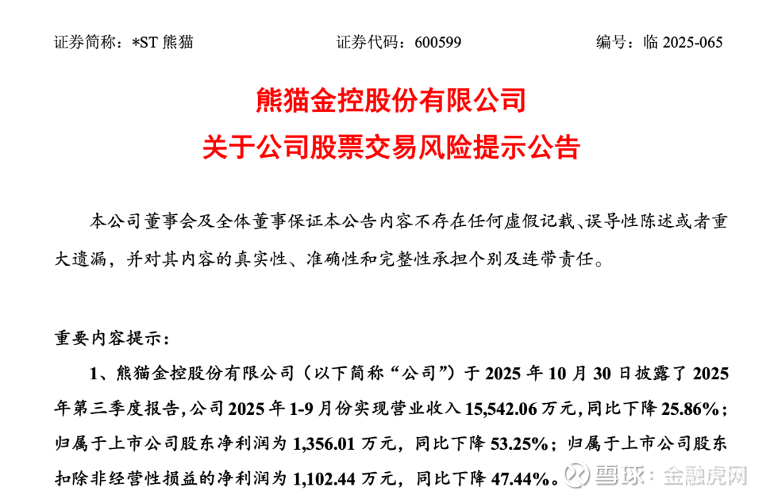从业绩表现来看,熊猫金控在2025年前三季度面临严峻挑战。公司于10月30日披露的2025年第三季度报告显示,1 - 9月份实现营业收入15,542.06万元,同比下降25.86%;归属于上市公司股东净利润为1,356.01万元,同比大幅下降53.25%;归属于上市公司股东扣除非经营性损益的净利润为1,102.44万元,同比下降47.44%。业绩的下滑无疑给公司未来发展蒙上一层阴影。