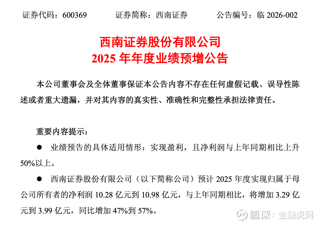 金融虎讯 1月15日消息,日前,西南证券股份有限公司发布2025年年度业绩预增公告。公告显示,公司预计在过去的2025年度实现盈利,且净利润与上年同期相比上升幅度超50%。