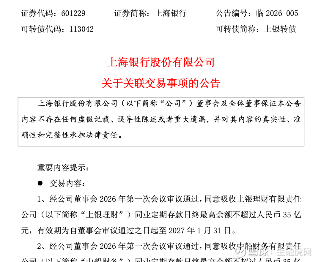 金融虎讯 1月27日消息,上海银行股份有限公司发布关于关联交易事项的公告。公告显示,上海银行董事会于2026年第一次会议上,审议通过了三项吸收同业定期存款的重要决策。