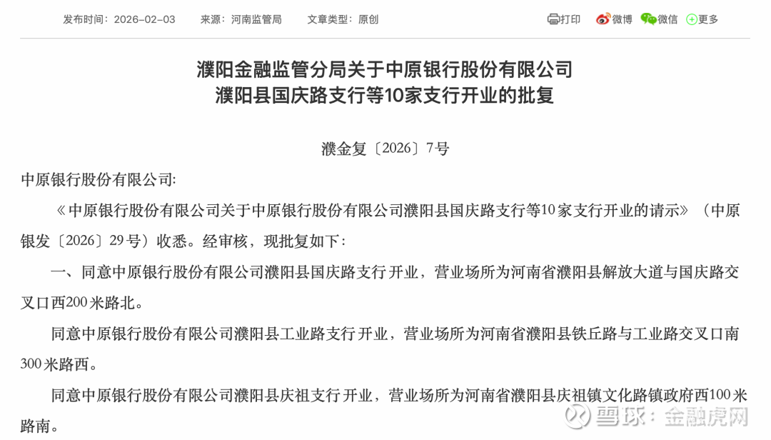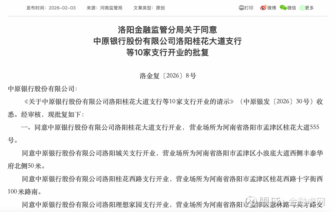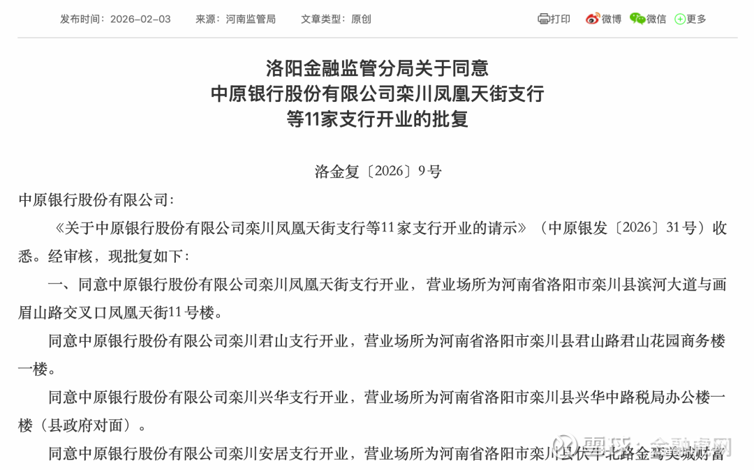 金融虎讯 2月3日消息,河南洛阳与濮阳两地金融监管分局发布重要批复,同意中原银行股份有限公司共计31家支行开业。