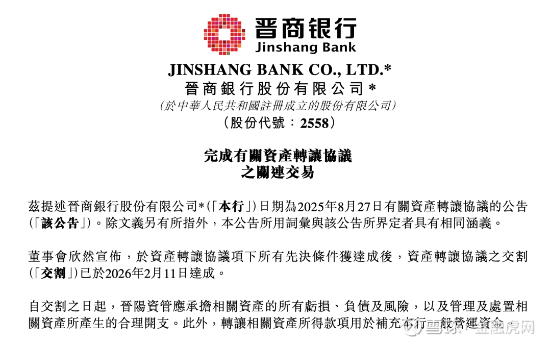 晋商银行曾于2025年8月27日发布有关资产转让协议的公告。日前,该行董事会欣然宣布,在资产转让协议项下所有先决条件获达成后,资产转让协议的交割已于2026年2月11日顺利完成。