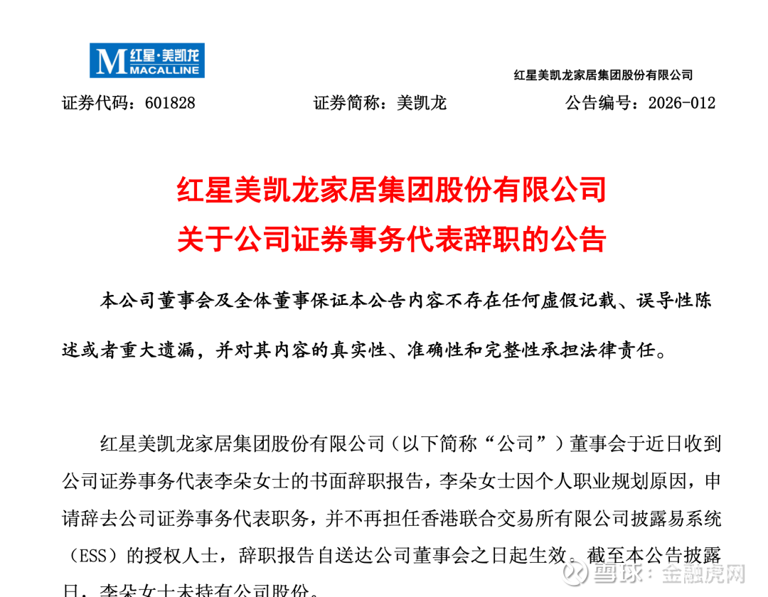 金融虎讯 3月11日消息,日前,红星美凯龙家居集团股份有限公司发布关于公司证券事务代表辞职的公告。公告显示,红星美凯龙董事会于近日收到公司证券事务代表李朵女士的书面辞职报告。李朵女士因个人职业规划原因,申请辞去公司证券事务代表职务,同时不再担任香港联合交易所有限公司披露易系统(ESS)的授权人士,且辞职报告自送达公司董事会之日起便生效。值得注意的是,截至本公告披露日,李朵女士未持有公司股份。