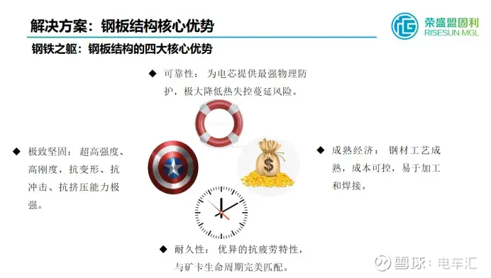 面对矿卡领域的特殊需求,荣盛盟固利创新性地提出了钢板结构PACK的设计理念。该理念以超高强度、超耐腐蚀和高可靠性为核心目标,通过采用高强度钢板作为主体材料,重构了PACK的设计哲学。王新民在演讲中详细阐述了钢板结构PACK的四大核心优势: