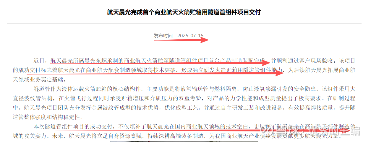 在最热门的朱雀三号可回收火箭项目中,航天晨光全程深度参与:提供耐温达1300℃的燃料输送金属软管,保障极端环境下的燃料稳定输送;供应动力系统关键组成部分燃气发生器;中标2.7亿元合同,提供液氧甲烷加注系统、火箭运输车及燃料加注车等核心地面支持设备。不仅如此,其还成功交付首个商业航天火箭贮箱隧道管组件,填补了该领域技术空白,为液体运载火箭贮箱的安全运行提供核心保障。从箭体“血管”(金属软管)、“骨架”(结构件)到地面“后勤保障”(加注系统、运输车),航天晨光构建了覆盖商业航天发射全链条的核心配套能力,完美契合了可回收火箭规模化、卫星批产化的行业需求。