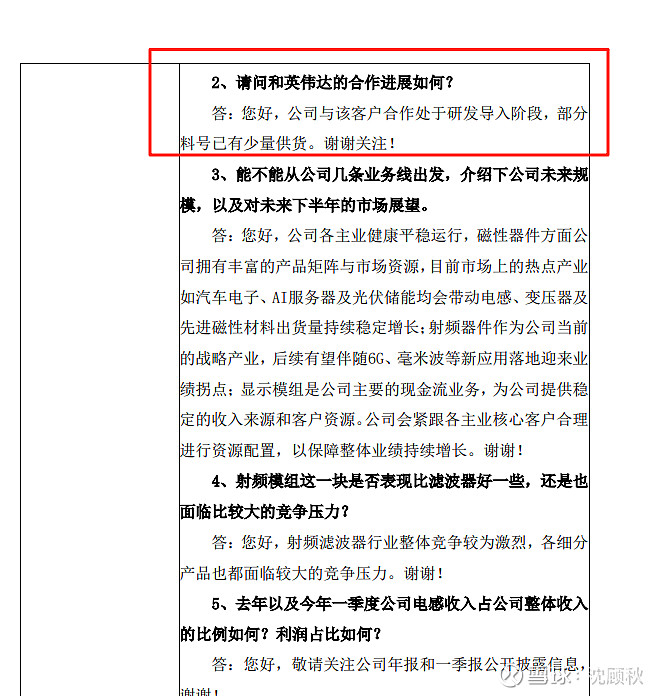 3、问:和英伟达的合作进展;答:公司与该客户处于研发导入阶段,部分料号已经有少量供货。这是五月份的投资者调研纪要,已经是实锤英伟达供货了,现在八月份,过了客户验证阶段,估计已经批量供货了。
