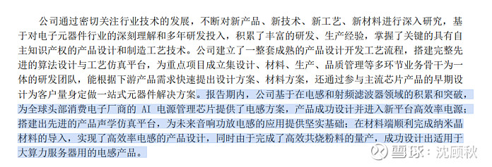 2、告期内,公司基于在电感和射频滤波器领域的积累和突破,为全球头部消费电子厂商的 AI电源管理芯片提供了电感方案,产品成功设计并进入新平台高效率电源:搭建出先进的产品声学仿真平台,为未来音响功放电感的应用提供坚实基础:在材料端顺利完成纳米品材料的导入,实现了高效率电感的产品设计,同时由于完成了高效共烧粉料的量产,成功设计出适用于大算力服务器用的电感产品。