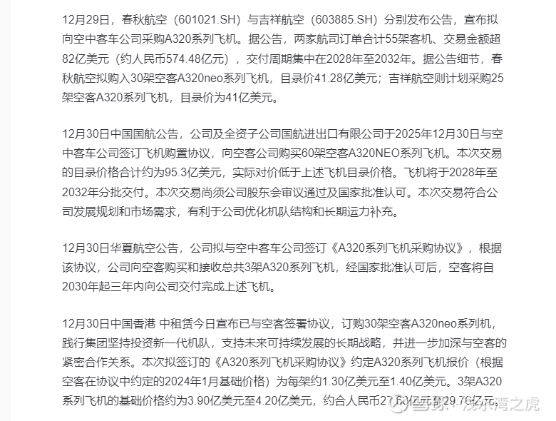 自法国总统马克龙2025年底访华以来,中法航空领域合作迎来密集落地期。近日,中飞租赁、中国国航、春秋航空、吉祥航空、华夏航空五家航司相继宣布大额空客飞机采购计划,48小时内合计订购148架空客A320neo系列飞机,目录总价超268亿美元,交付周期集中于2028-2032年。这股采购热潮不仅彰显了中国航空市场的强劲复苏动能,更让深度绑定空客天津总装线的天保基建(000965.SZ)迎来发展新机遇,凭借独特的股权布局与产业协同优势,成为中法航空合作红利的直接受益者。