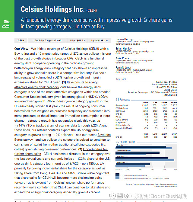 高盛:投资者们普遍认为CELH应继续在快速增长的能量饮料品类中抢占份额,尽管Alani Nu增长的可持续性/持久性是最大的关注焦点。我们与大多数投资者交谈时,他们在很大程度上同意我们对CELH的看涨观点(即几乎没有反对意见),这主要得益于品类趋势的改善、可能的份额增长以及对Alani Nu的收购。此外,投资者们同意管理层正在采取正确的步骤来改善和优化其产品组合,包括针对Celsius品牌的某些有针对性的修剪,因为可用口味的广度较大。在其他方面,我们也对Celsius即将推出的限时产品(LTO)感到非常鼓舞,我们相信这将推动试用并产生嗡嗡效应——从而帮助在CELH的各种品牌和口味之间创造光环效应。事实上,我们最近从行业联系人那里了解到,新的Celsius LTO将是“Spritz Vibe”——这可能相当成功,因为它模仿了受欢迎的Aperol Spritz的口味轮廓,并很可能在NACS上亮相。尽管如此,大多数投资者的辩论都集中在CELH维持强劲增长的能力上,特别是Alani Nu。虽然我们理解这种怀疑,尤其考虑到其他几个品牌在强劲表现期后失去了相当大的份额(例如Bang),但我们仍然乐观地认为,PEP强大的分销网络将有助于推动Alani Nu品牌的显著分销增长,正如PEP的网络自2022年以来帮助推动Celsius品牌的强劲增长/分销一样。此外,我们相信Alani Nu(及Celsius)可以帮助吸引增量消费者进入该品类,特别是随着该品牌的分销扩展。除了在美国可能的份额增长(基于我们的估计)之外,我们还相信CELH可以继续增长其国际业务占比,目前约为合并销售额的3.4%(截至2025年第二季度),相比之下MNST在美国以外的敞口为40%。此外,我们预计CELH的毛利率应逐渐继续受益于采购、生产和货运机会的规模效率,随着CELH的轨道模型的推进。最终,我们对CELH继续抢占增量份额的能力保持信心,因为他们继续扩展能量饮料品类,这得益于令人印象深刻的创新、进一步的分销/货架空间增长、核心消费者消费更多,以及进一步的品牌/品类转变。因此,我们重申我们的买入评级和72美元的目标价。