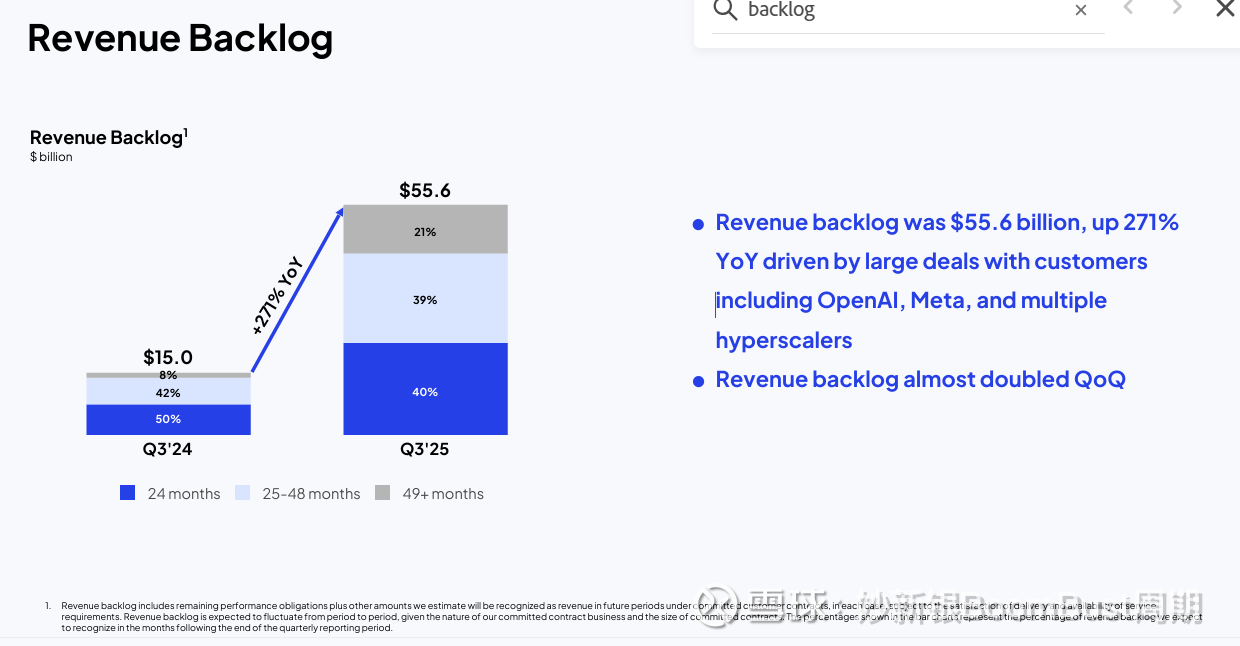 CoreWeave 宣称拥有 550 亿美元的“收入积压”。但8K 显示,这个积压不仅包括已经签署合同中剩余履约义务(RPOs),还包括“其他受交付和可用性限制的估计金额”。用通俗的话说,这意味着“如果我们能建成,我们就会收费”。