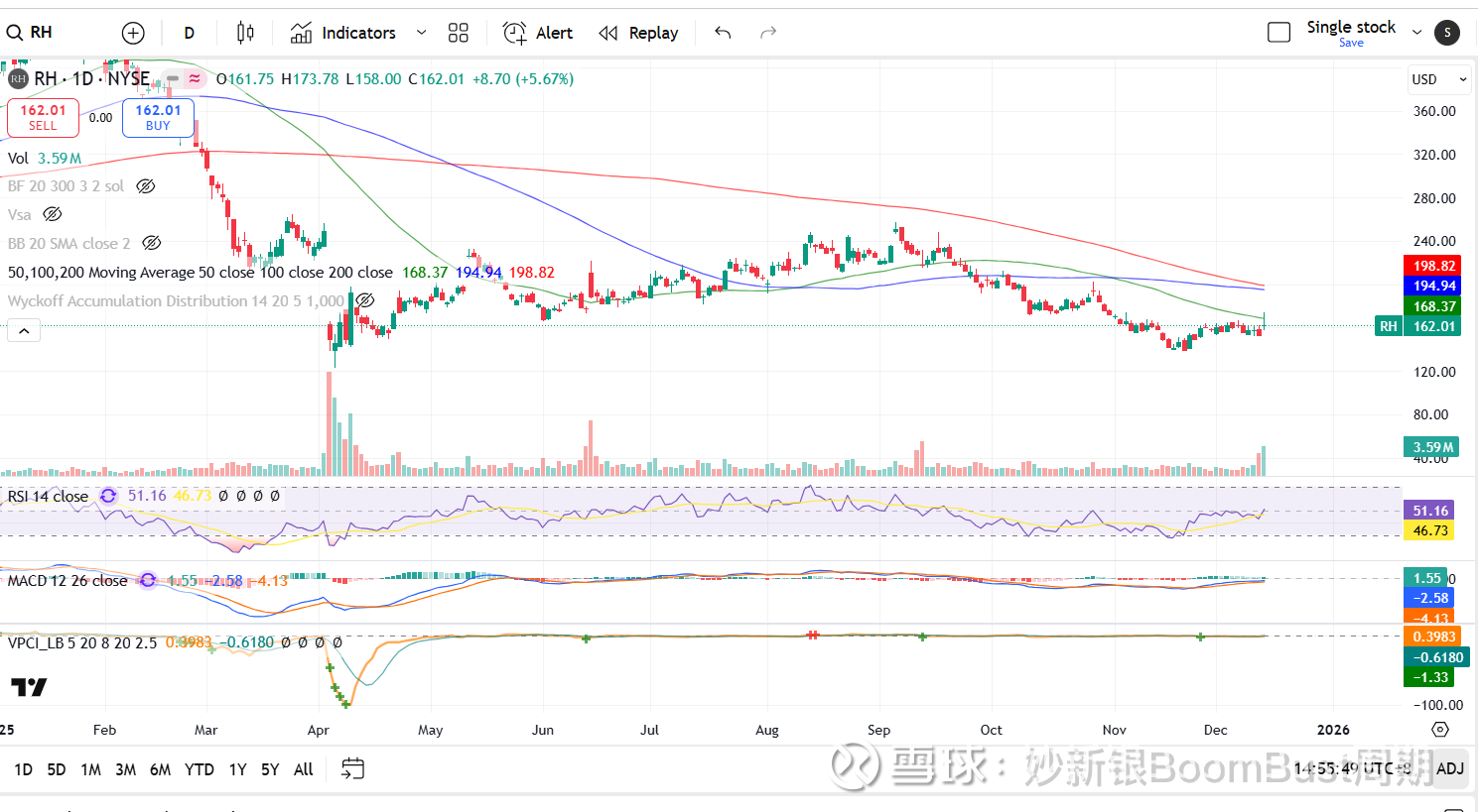 当我们读到“50年来最糟糕的住房市场”(Toll Brothers和RH都提到)时,我们闻到周期性低谷和大上行空间。当TOL(高估)预测2026年无复苏时,这听起来像是底部。我在12月初买了一些RH股票 - 它很便宜(13倍P/E,向前约8% FCF收益率),正在经历地狱(关税打击利润率、糟糕的住房市场、重资本支出周期),但一切都是暂时的。价格可能在2026年不会反弹,但如果愿意等待,有很大的安全边际和大上行空间。