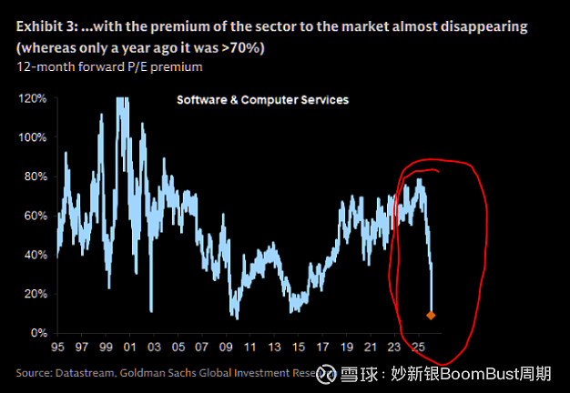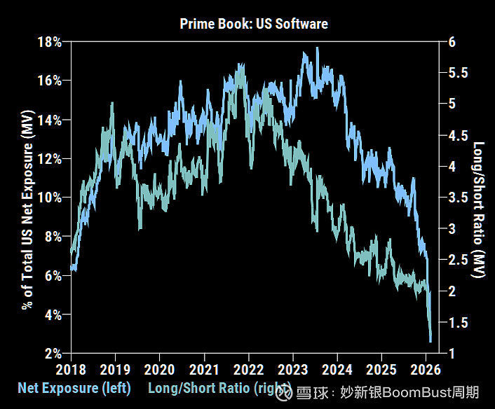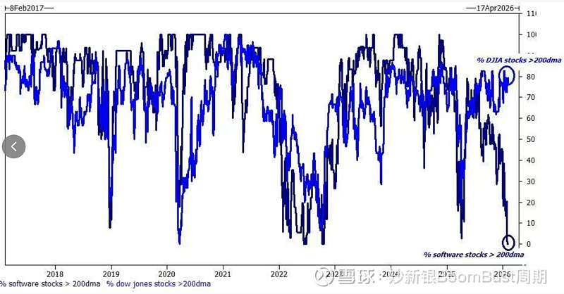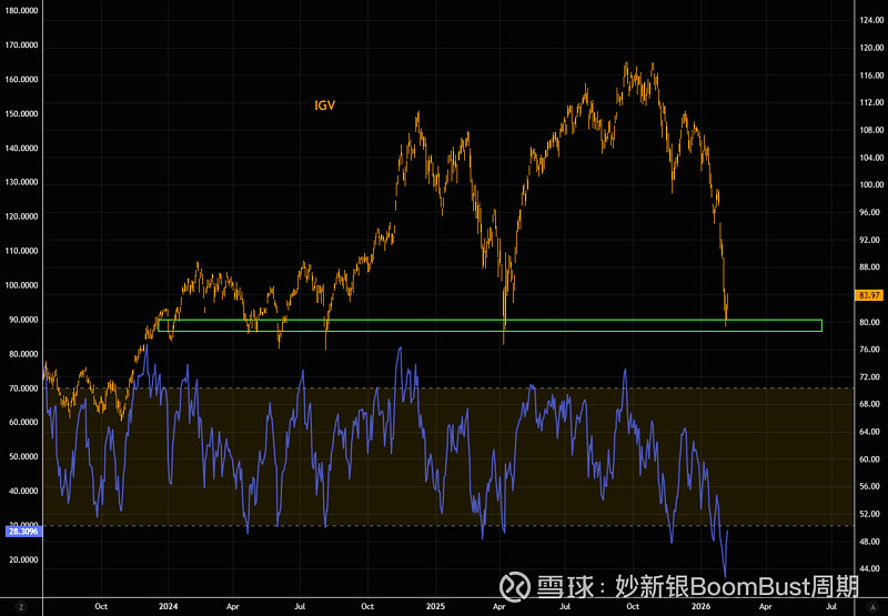 软件的仓位、短期动能决定了卖出力量衰竭IGV RSI 反弹到28 还是很低对冲基金净仓位接近0软件的估值溢价完全消失没有任何软件股在200ma之上