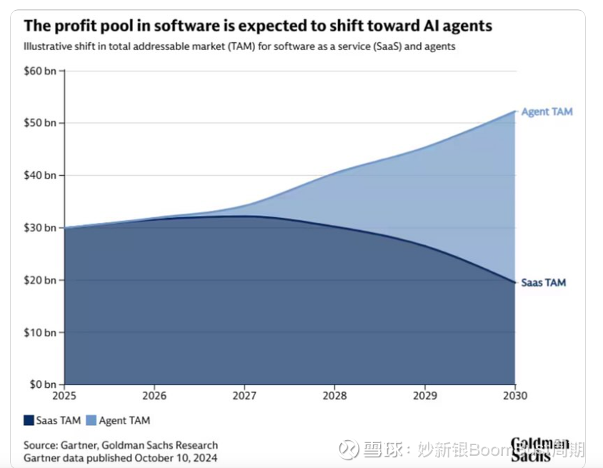 Brad 的回应:利润池转移 软件非死,而是利润池从 SaaS 向代理层(Agentic Layer)转移(Goldman Sachs 报告支持)。 估值暴跌因 TAM(总可寻址市场)永久缩小,终端价值折扣率飙升。 逆转路径:加速核心营收增长,证明 AI 受益(如 Databricks、Snowflake、ClickHouse 最近增长超 60%,因 AI 依赖数据转型)。