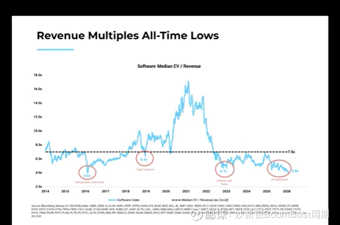 Brad:SaaS 估值崩盘原因 SaaS 股当前估值创历史低:前瞻营收倍数 3.9x(历史低点),自由现金流倍数也创低(见播客图表)。 营收稳定或增长,但股价下跌因 AI 带来的不确定性:投资者对未来自由现金流耐久性打折(如 Salesforce 自由现金流倍数从 30x 降至 15x,意味着投资者只愿为 15 年而非 30 年现金流付费)。 核心:AI 颠覆导致“未来不确定”,尽管公司短期击中业绩,但长期估值重置。