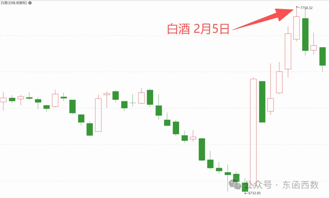 白酒本轮触底反弹是是阵营式上涨手法。炒龙头股的人都知道,在阵营式炒作手法里,龙一冲不动了,板块就容易回调。白酒上周的龙一明显是皇台酒业,在2月5日那天不涨停,根据龙头战法的原理,这对板块来说就是个不好的左侧信号。所以我那天才说,白酒反弹基本到位了。我话音刚落,第二天白酒就开始跌了。