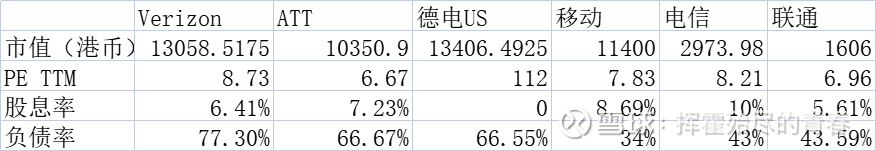 财务方面,目前三大运营商市值差别不是很大,德电由于收购成长迅猛。股息率差中三大一部分,负债高很多,几千亿的负债差异。