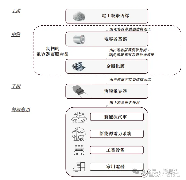 据招股书,公司是以2024年的电容器基膜销量计,公司是中国第二大的电容器薄膜制造商。公司的电容器薄膜产品主要包括(i)电容器基膜及(ii)金属化膜。该等产品为薄膜电容器的关键组成部分。薄膜电容器的终端应用场景广泛,包括(i)新能源汽车,(ii)新能源电力系统,(iii)工业设备及(iv)家用电器。