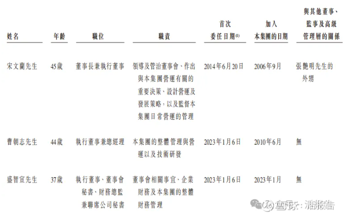 公司董事高层由4位执行董事、1位非执行董事及3位独立非执行董事组成,其中宋文兰为公司董事长兼执行董事,其主要负责领导及管治董事会、作出与公司营运有关的重要决策、设计营运及发展策略,以及监督公司日常营运的管理。