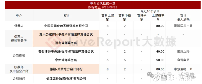 据LiveReport大数据统计,海伟电子中介团队共计7家,其中保荐人1家,保荐项目数据表现整体尚可;公司律师2家,综合项目数据整体不尽如意。整体而言中介团队历史数据整体表现普通。