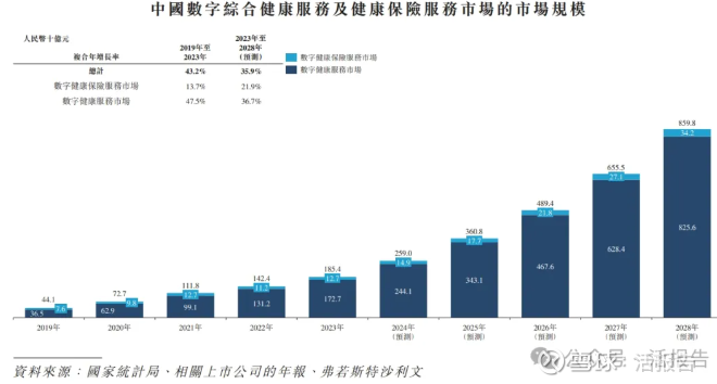 根据弗若斯特沙利文(Frost & Sullivan)报告,随着互联网用户群不断扩大及人们健康意识不断提高,数字健康销售的渗透率(按中国数字健康服务市场的市场规模与健康服务市场总规模的比率计算)由2019年的0.6%增长至2023年的2.3%,并预期于2028年将达至7.3%。数字健康保险销售的渗透率亦呈现相似增长趋势,由2019年的5.1%增长至2023年的6.6%,并预期于2028年将达至11.1%。渗透率不断提高推高了中国数字综合健康服务及健康保险服务的市场规模(按收入计),由2019年的人民币441亿元增至2023年的人民币1,854亿元,复合年增长率为43.2%,并预期于2028年将达至人民币8,598亿元,自2023年至2028年的复合年增长率预期将为35.9%。中国数字综合健康服务及健康保险服务市场(按服务类型划分)包括数字健康服务市场及数字健康保险服务市场。
