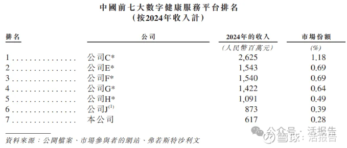 根据弗若斯特沙利文数据,按2024年收入计,公司于中国数字综合健康服务及健康保险服务市场排名第10位。具体而言,根据同一资料来源,按2024年收入计,公司在中国数字健康服务市场排名第七。