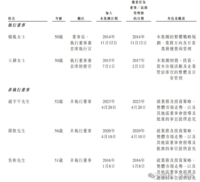 公司董事会由八名董事组成,包括两名执行董事、三名非执行董事及三名独立非执行董事。杨胤女士为董事长、执行董事兼首席执行官,主要集团的整体战略规划、业务方向及日常业务运营与管理。