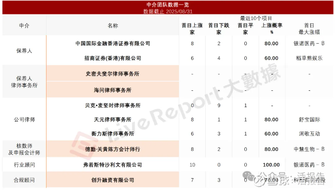 据LiveReport大数据统计,轻松健康中介团队共计10家,其中保荐人2家,近10家保荐项目数据表现尚可;公司律师共计3家,综合项目数据表现平平。整体而言中介团队历史数据表现较好。