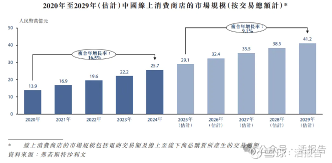 根据弗若斯特沙利文,按交易总额计,中国在线消费商店的市场规模由2020年的人民币13.9万亿元增加至2024年的人民币25.7万亿元,期内复合年增长率为16.5%。该快速增长主要得益于大数据、云计算及人工智能等创新技术的发展、消费者需求越趋多元化以及利好的政策环境。预测期内,受行业深入应用新兴技术所推动,预计中国在线消费商店的市场规模将由2025年的人民币29.1万亿元进一步增加至2029年的人民币41.2万亿元,复合年增长率为9.1%。2024年中国消费领域在线商店市场占中国整体零售市场的份额达到36.9%,预计该份额将在预测期内进一步增加。