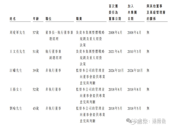 公司董事高层由2位执行董事、4位非执行董事及3位独立非执行董事组成,其中周爱军为董事长、执行董事兼总经理,其主要负责公司的整体战略规划及重大经营决策。