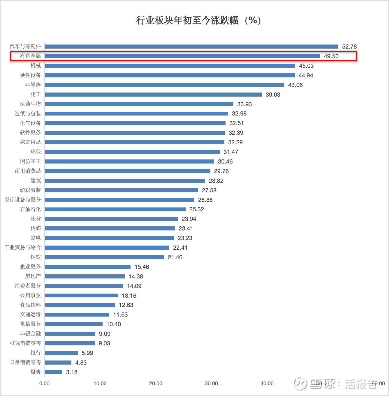 今年二级市场上,有色金属板块上涨近50%,板块排名第二。随着产业经济复苏,特别是新能源汽车、电子信息、航空航天等领域,对有色金属的需求也持续增长,例如新能源汽车对锂电池、电机等需求激增,也带动对铝、锂、铜等需求增长。