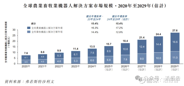 根据弗若斯特沙利文(Frost & Sullivan)的资料,从2020年到2024年,农业畜牧业机器人解决方案市场的总收入从约76亿美元增长至135亿美元,复合年增长率为15.4%。农业机器人解决方案收入从41亿美元增至75亿美元,增长动力来自自动驾驶系统、水管理系统、精准播种、精准撒药、精准收割以及GNSS平台的日益采用。畜牧机器人解决方案收入从35亿美元增至60亿美元,主要受到自动喂养、动物监控及挤奶系统需求上升的驱动,尤其在集约化养殖作业中表现突出。