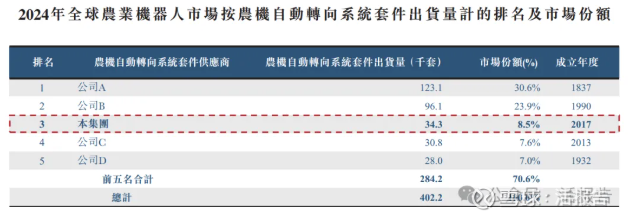 根据弗若斯特沙利文(Frost & Sullivan)的资料,2024年全球农业机器人市场仍然集中,前五名供应商占农机自动转向系统套件出货量约70.6%。本集团于主要参与者中排名第三,在2024年按全球农机自动转向系统套件出货量计占约8.5%的市场份额。