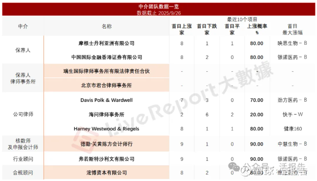 据LiveReport大数据统计,丰疆智能中介团队共计10家,其中保荐人2家,近10家保荐项目数据表现良好;公司律师共计3家,综合项目数据表现参差不齐。整体而言中介团队历史数据表现较好。