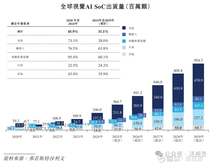 根据弗若斯特沙利文(Frost & Sullivan)的报告,以出货量计,全球视觉AI SoC市场规模由2020年的54.3百万颗增长至2024年的246.0百万颗,2020年至2024年复合年增长率为45.9%,预计全球视觉AI SoC出货量将在2029年进一步增长至954.3百万颗,2024年至2029年复合年增长率为31.3%。