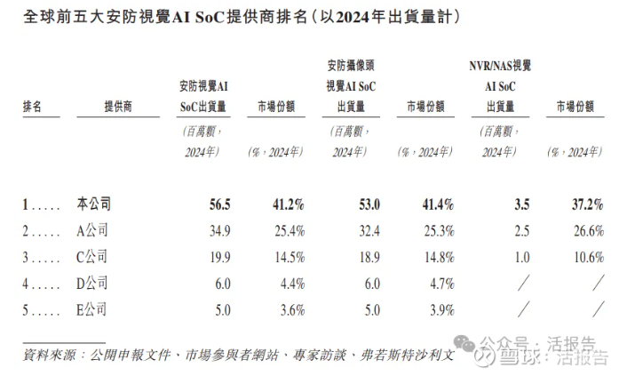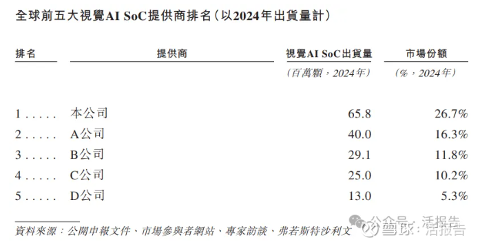 根据弗若斯特沙利文的资料,按2024年的出货量计算,公司是全球最大的视觉AI SoC供货商,占据26.7%的市场份额;公司的安防视觉AI SoC位居全球首位,占据41.2%的市场份额。按2025年上半年的出货量计算,公司的机器人视觉AI SoC位居全球第二,占据23.0%的市场份额。