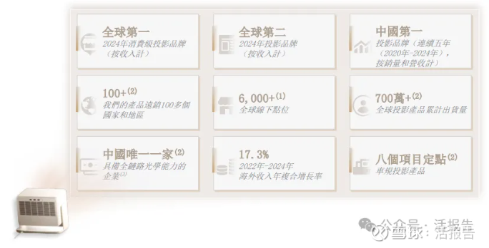 公司是全球投影行业的领军者,致力于各种消费级、车规级、工程级智能投影产品的研发、生产与销售。根据弗若斯特沙利文的资料,以2024年收入计,公司是全球第一大消费级投影品牌。