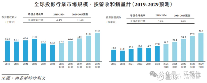 根据弗若斯特沙利文(Frost & Sullivan)的报告,全球投影行业的销量规模在2019年至2024年间呈现出波动增长的态势,2024年销量规模回升至1,701.2万台,预计在2024至2029年间,将以13.0%的年复合增长率保持增长。