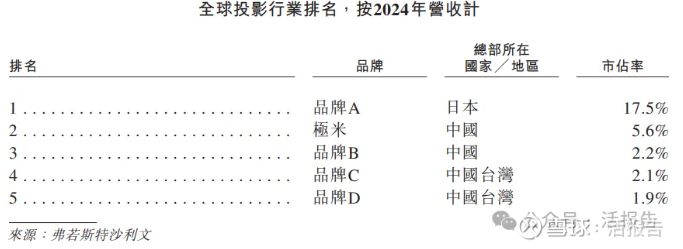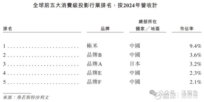 按2024年营收计,极米在全球消费级投影行业中排名第一,市占率达到9.4%。